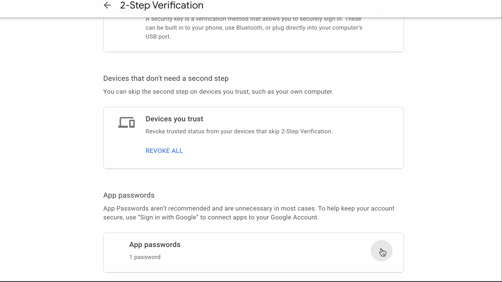 Note: you need to have 2-Step Verification turned ON in order to see the App passwords section. Check this article if you need help with 2-Step Verification.