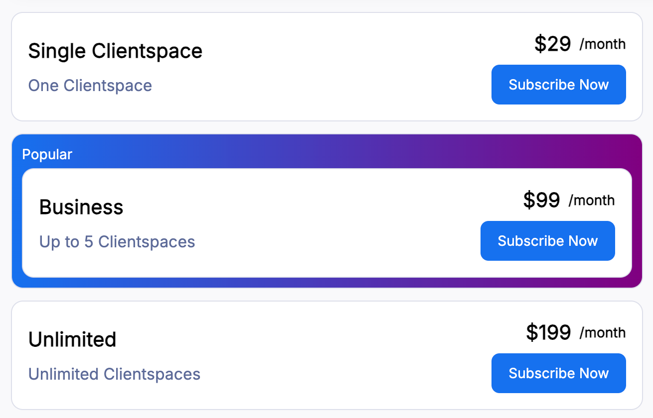 Each Clientspace costs a minimum $29/month.