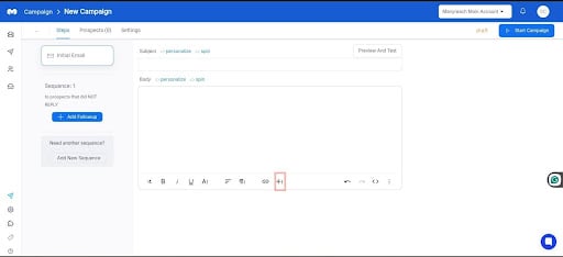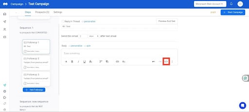 Once you're inside the campaign, go to your sequence, and click the code view“<>” icon at the right corner of your “Email Compose” section.