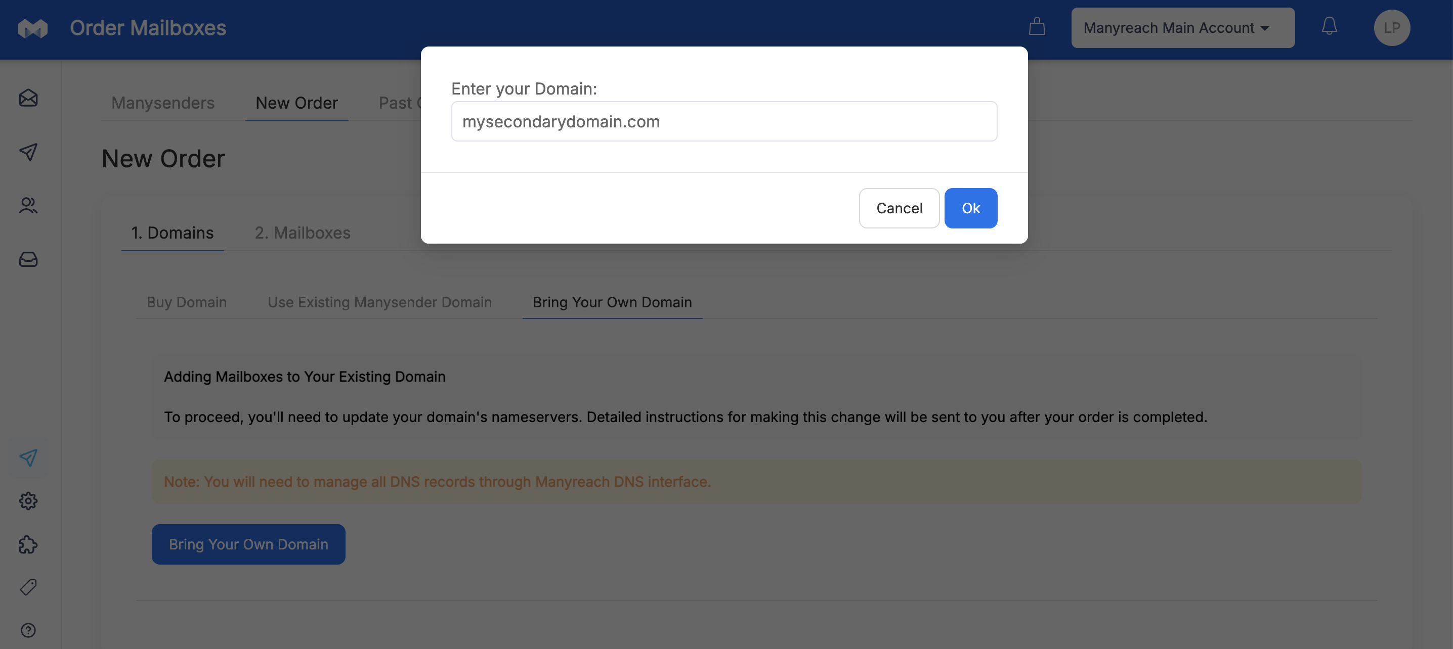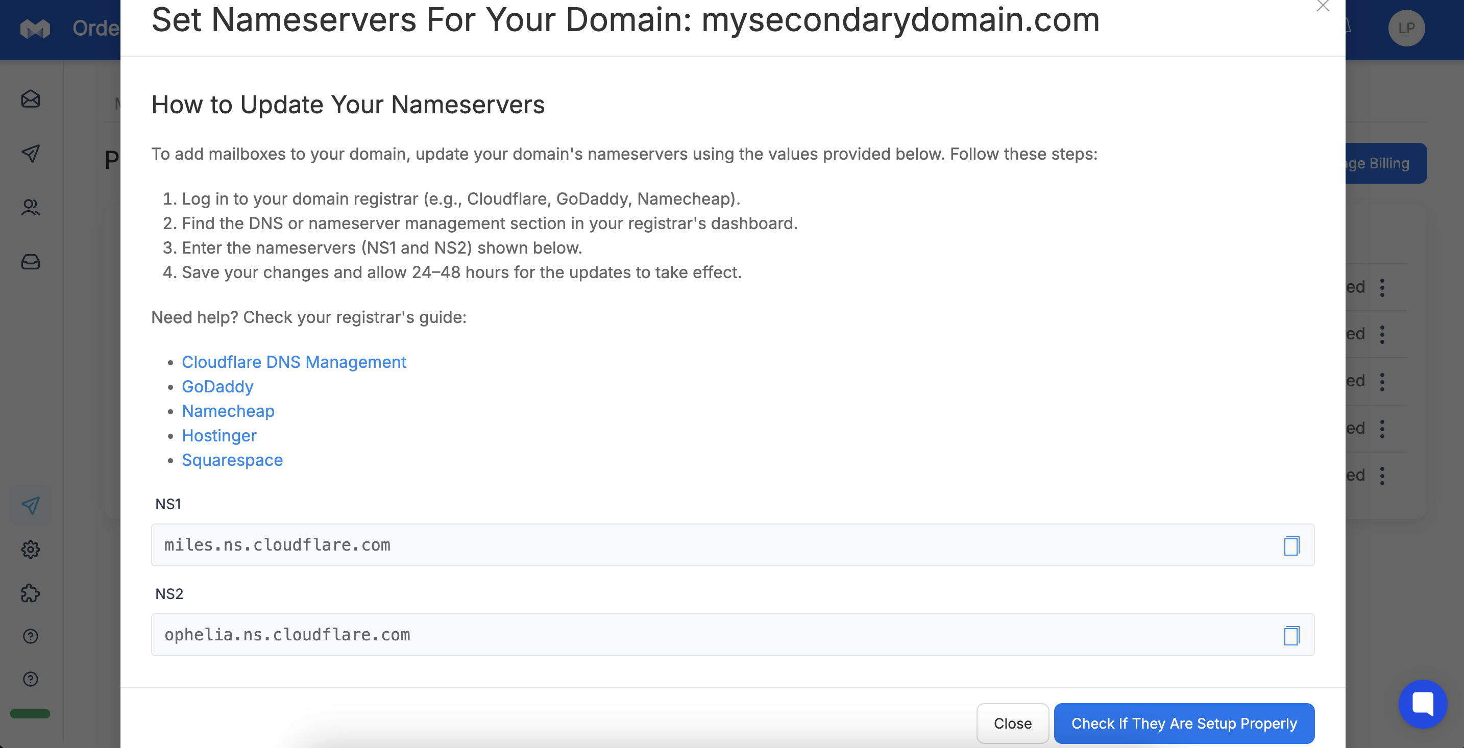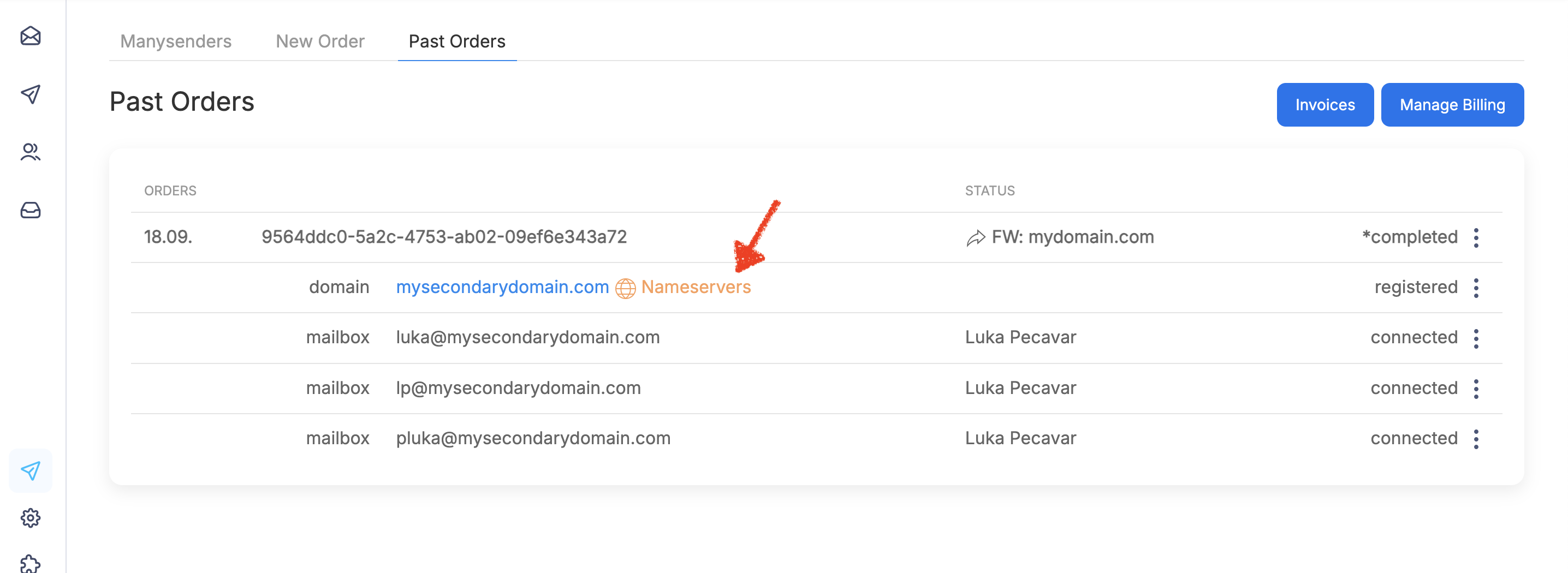 6. Once our system detects all domains have properly set name servers, we’ll proceed with the creation of Manysender mailboxes and connecting them to your account.