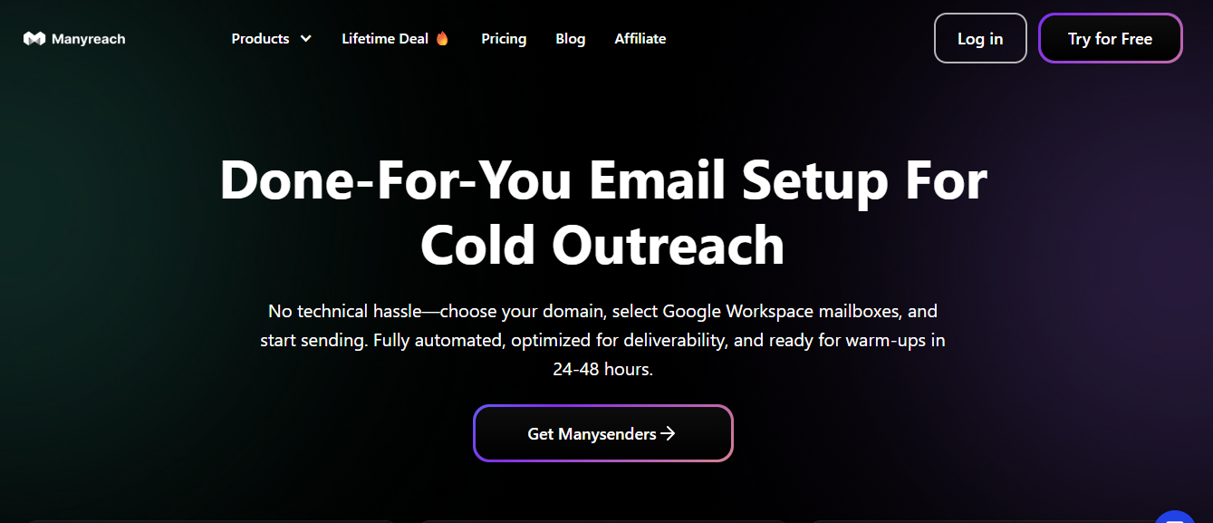 Manysenders is a done-for-you cold email infrastructure service that will set up your domains, mailboxes, and warmup so you can start outreach without technical hassles.