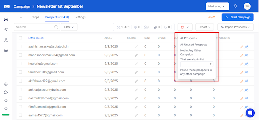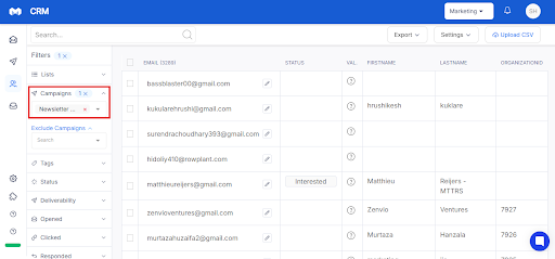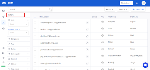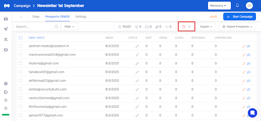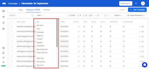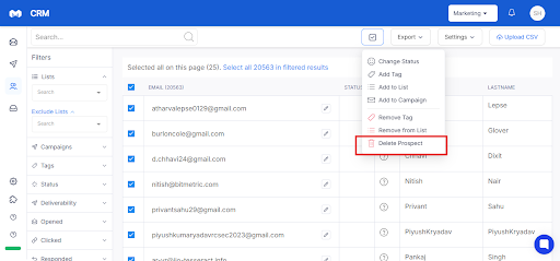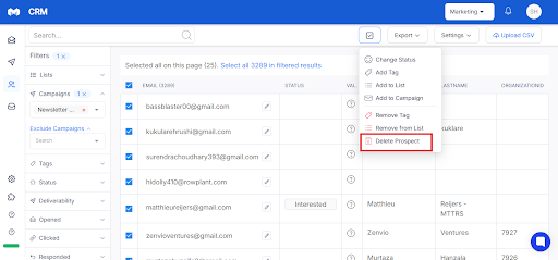 2. Apply filters to narrow down the prospects you want to remove; for example, Not Interested, Bounced, etc.