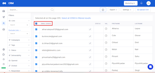 3. After filtering, select the specific leads, or you can also use the checkboxes to select all displayed leads.