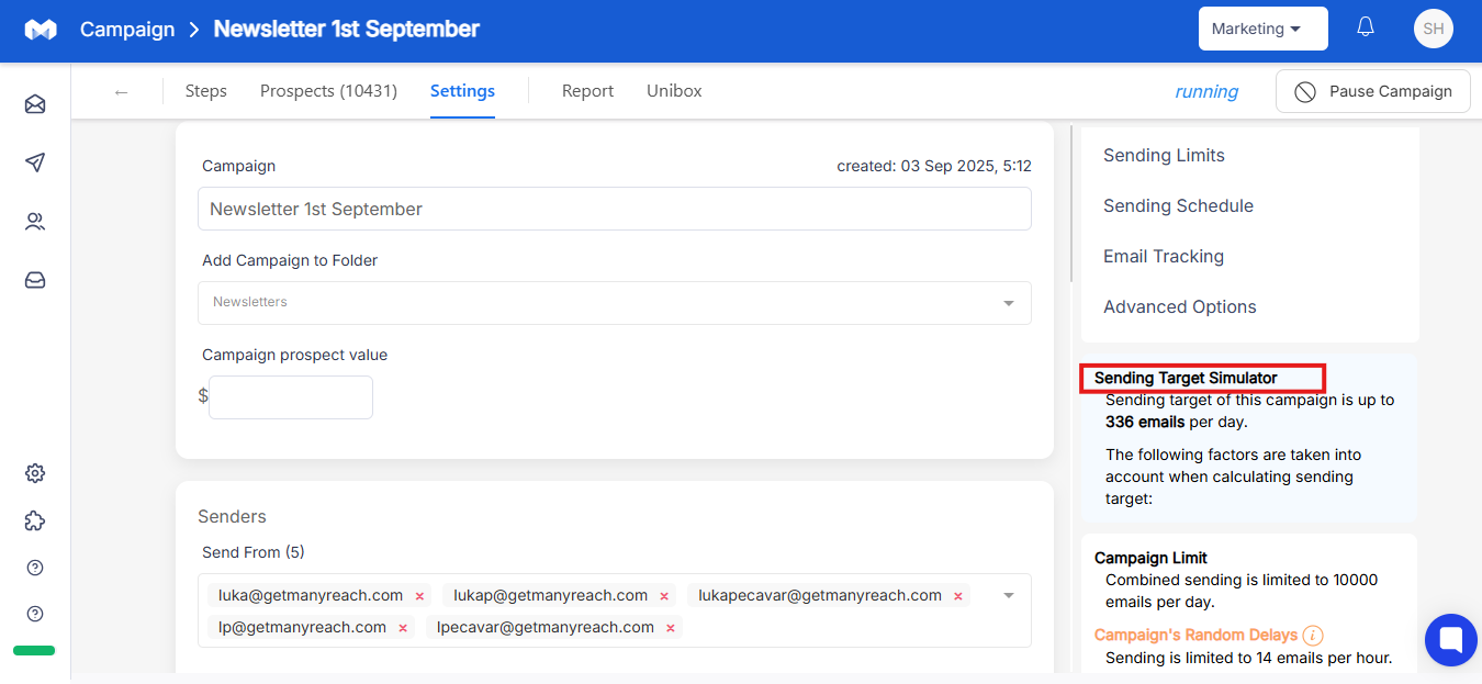 2. Now, go to Settings and find the campaign limit under the Sending Target Simulator on the lower end of the right-hand side.