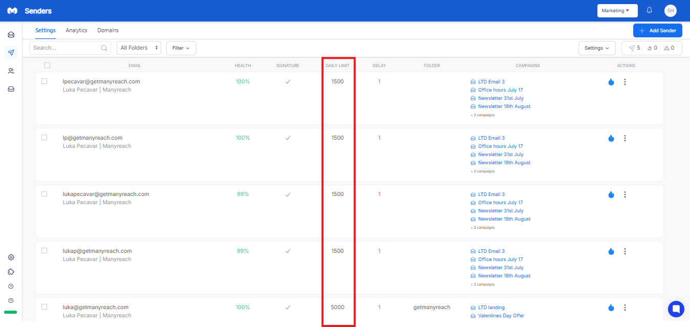2. On the Senders’ list, you’ll find each sender and their per-day sending limit.