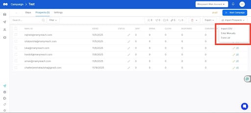 Click the “Import Prospects”, and you will find three options: Import CSV, Enter Manually, From the List.