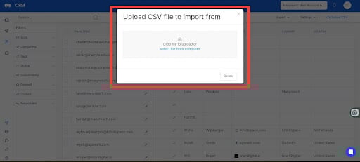 Once you’re on your CRM, find the “Upload CSV” option, on the top right corner of the page.